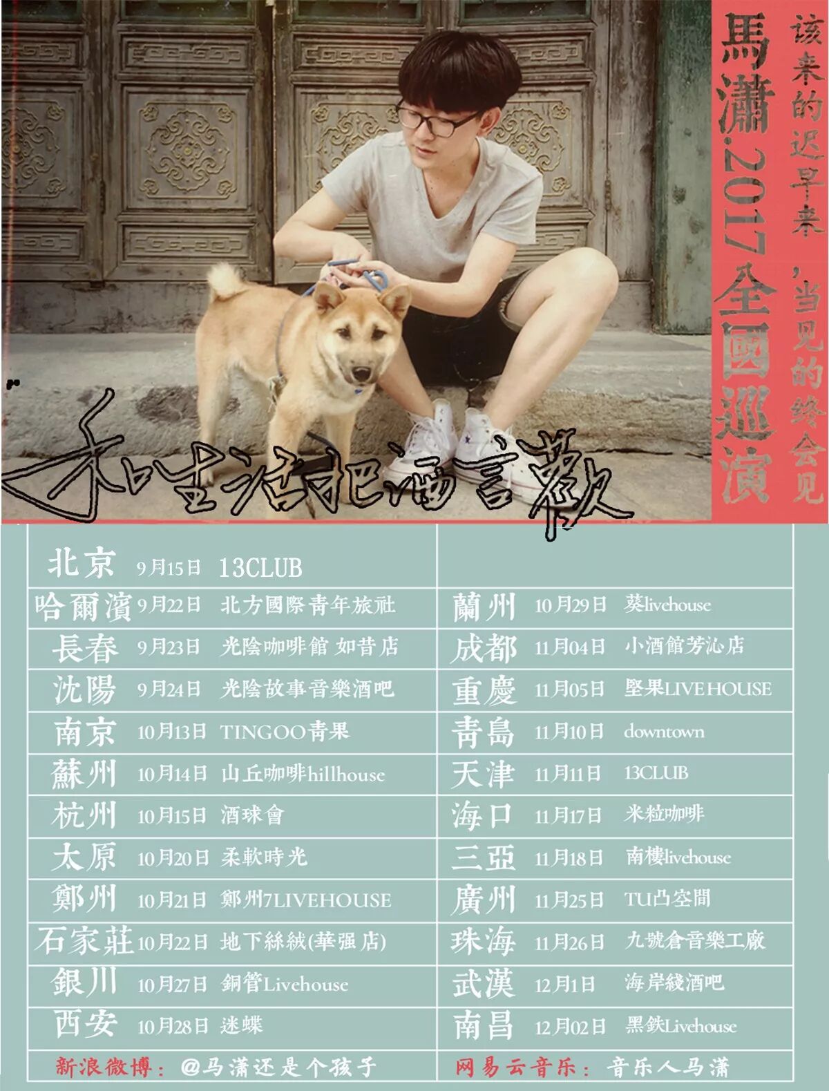 他既是中山大学哲学系高材生,也是永远在路上的浪荡歌者。从早先的《请你爱我或给我一把枪》,再到后来的《疯魔成性》、《不愿哭泣的你》,歌里的哲学式的审问和独特的音乐审美激荡碰撞。音乐、思考、游历,便汇聚成马潇所谈论的生活,正应了他在《宿命》里的那句歌词“和生活把酒言欢,愿我们款款深情”。九月份马潇已启程2017全国23站,如今巡演过半,本周六将来到成都,你愿意和他在这里来一场美好的相遇吗?