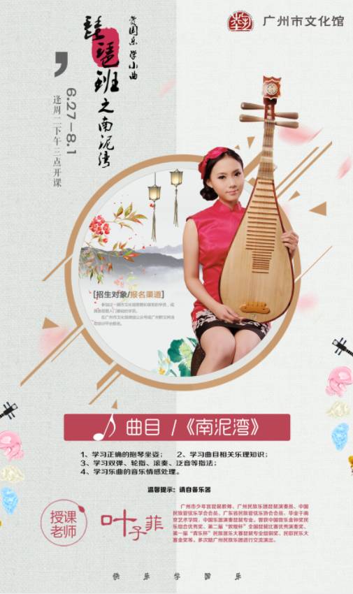 招生对象:具备琵琶入门基础的学员(欢迎参加过文化馆琵琶初级班的学员报名)