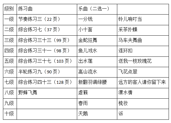 本考级定为十个级别,2016年各级别考试曲目按以下表格内的规定为准。要求如下: