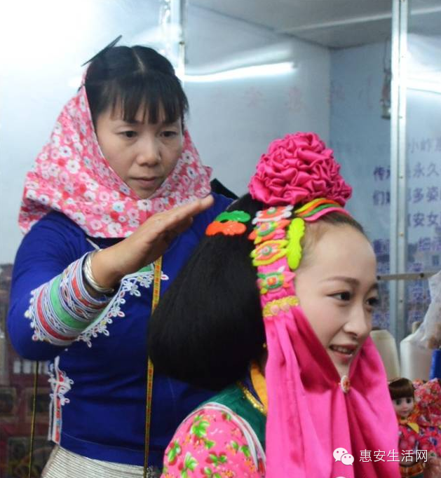 以往,小岞女儿嫁人都请年长的姑姑婶婶帮忙梳妆;而今,随着婚俗的简化,很多即便年长的人也都不会梳传统的惠女妆了。不过,镇上有一个年轻的女子不但会梳惠女妆,还会做婚装。