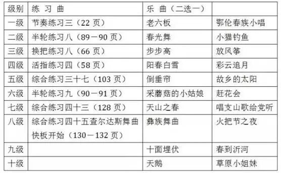 本考级定为十个级别,2017年各级别考试曲目按以下表格内的规定为准。要求如下: