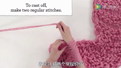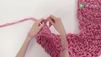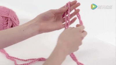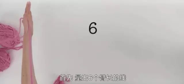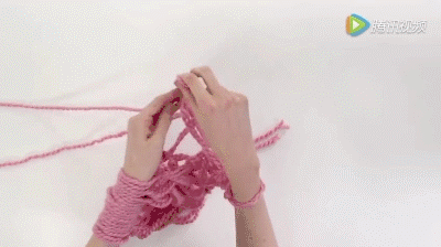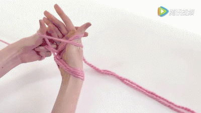 接着换右手拿毛线,同理,将毛线穿过左手毛线圈圈后,将毛线套在右手腕上。重复步骤四步骤五的动作,将毛线在左右手腕上反复交换,直到织成你想要的长度。
