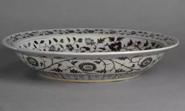 浅弧壁和宽板沿被模压成相等的八棱形,内外壁和板沿上的纹饰依次为16瓣仰莲纹、16组成双回纹、缠枝纹和8组折枝莲纹,每层纹饰均按模压的尺寸均匀排列;,外围凸脊以承杯,再外是缠枝菊纹;白釉黏稠,气泡密集,器底无釉,火石红显著。