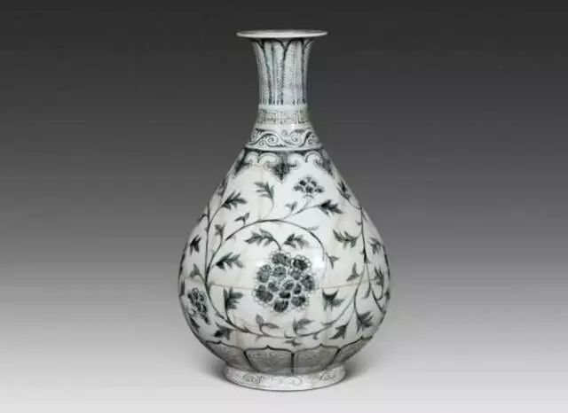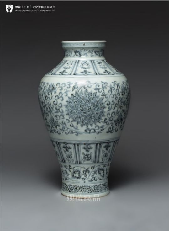 梅瓶小口,圆唇外卷,短颈,丰肩,肩下渐收,圈足。腹部主题纹饰为缠枝牡丹、菊花等花卉图案,繁密有致,豪放生动,构图饱满,胎质白中微泛灰,釉面莹润。形体高大,端庄规整,纹饰精美,堪称明洪武时期大件器物中之精品,体现了洪武时期高度的制瓷技艺。