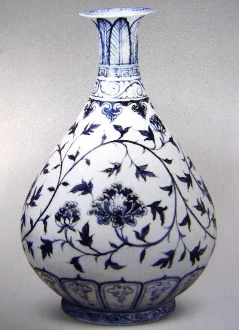 洪武青花的纹饰多简练流畅,豪放生动,以各种折枝、缠枝花卉纹为主,菊纹比较多见,多绘成扁椭圆形,非常具有时代特征;折枝或者缠枝莲纹大都呈螺丝状,而元代的缠枝莲纹多为葫芦状;同时元代叶形较大,为大花大叶,至洪武时则明显缩小,昔日的硕叶纹饰不复再现。