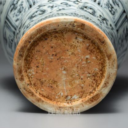 洪武朝瓷器底是中心有乳状突起,是元代器足的遗风。这种处理方法,是当时处于主流地位的工艺,具有明显的时代标志。有各种形式、种类繁多的圈足,常见的有圆涡形厚底足、高足、内壁斜削外倾斜式圈足等。此外,民窑青花碗,底面无釉,圈足深高,有的挖足过肩,残留刮削痕及同心圆跳刀痕,和元代器物相同,洪武朝的瓷器一般为砂底,露胎处均可见星点状或大片的火石红。后仿胎足的火石红斑,是人为点染而成,收藏时如仔细观察,不难看出破绽。