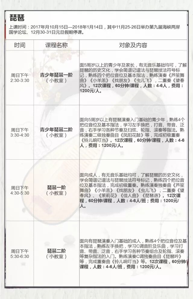 今日下午,筼筜书院2017秋季琵琶课程将要开始,琵琶有青少年和成人两种课程,每种课程都设有一阶、二阶两个班级,欢迎感兴趣的朋友来筼筜书院与王浣老师一起“轻拢慢捻弹古今”。