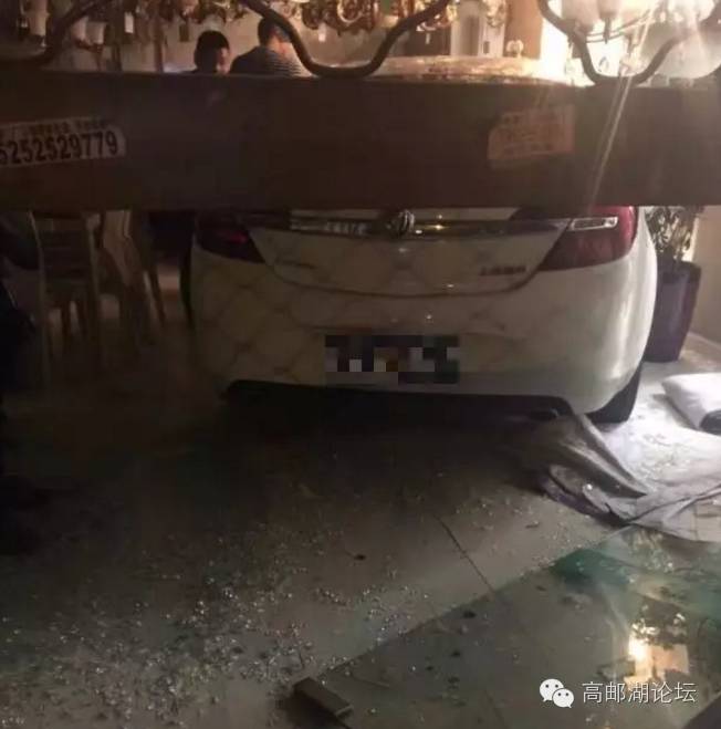一辆白色轿车冲进灯具店,把大门吧台撞得六散