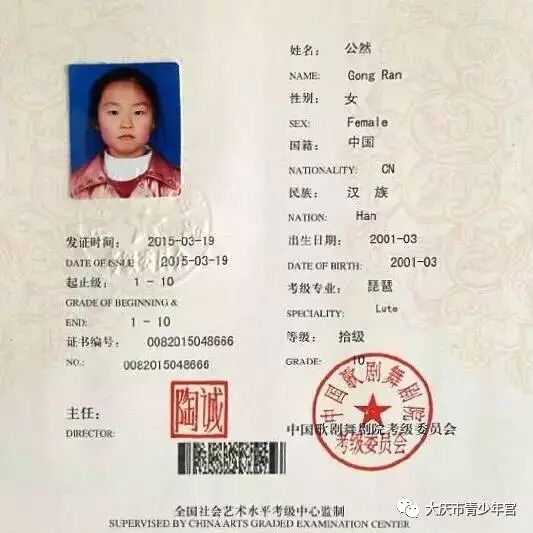 2015年取得中国歌剧舞剧院琵琶拾级专业证书及表演文凭级证书。