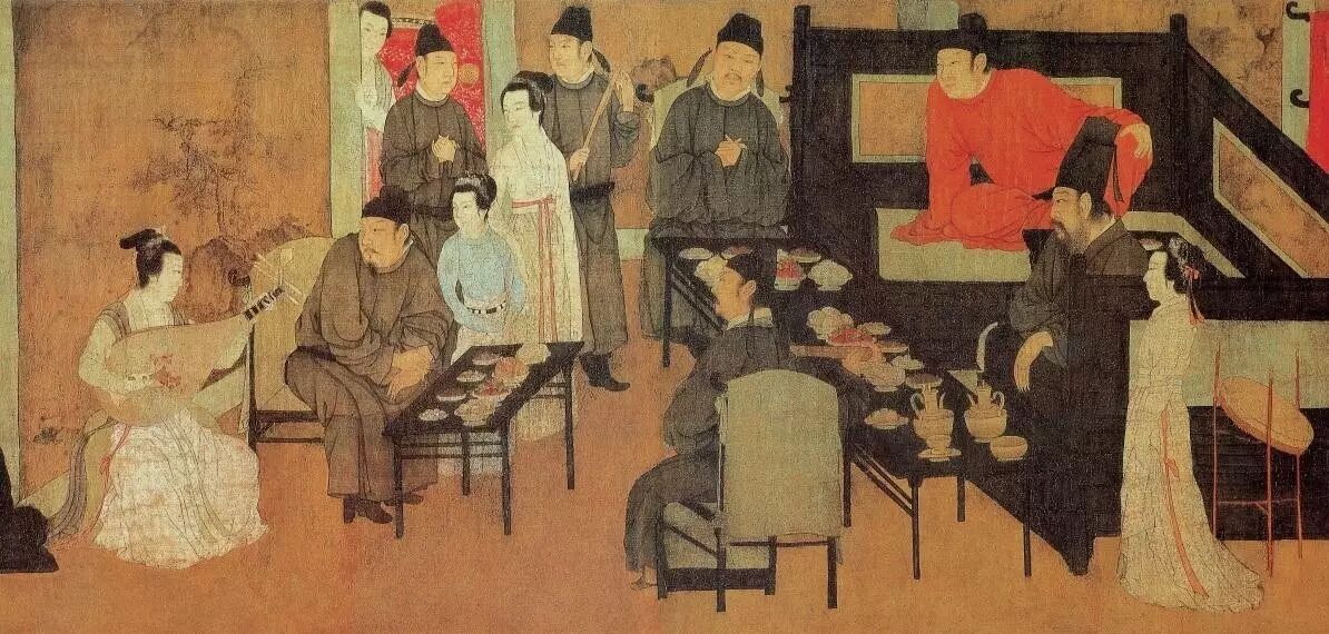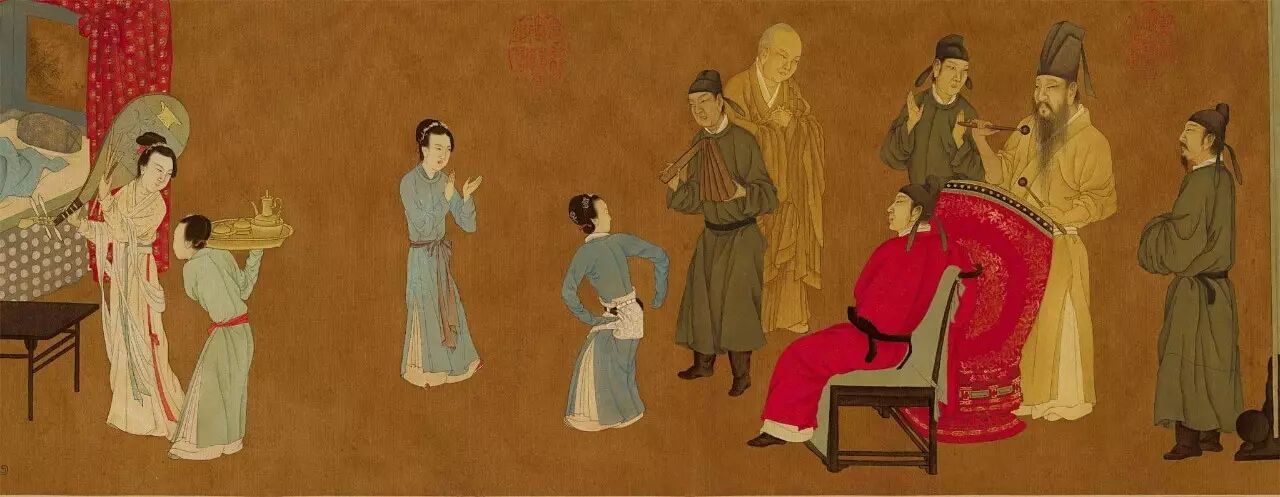 言归正传,小编打算把画中的音乐拿出来单独讨论一下。乐在古代排在文人必修科目“六艺”的第二位,显见它的重要性。文人与政客集于一身的韩熙载有极高的音乐素养,宴会中出现的教坊副使李家明太常博士陈致雍更是专业人士,画面“观舞”一段中韩熙载亲自为舞伎击鼓,显然是各种好手。本画的作者顾闳中,小编推断也熟识音律且具有相当的专业乐舞知识以及修养,从画面诸多细节可见。在“清吹”一段中,乐队演奏者的位置,乐器演奏的指法如若不是有相当音乐基础,仅凭观察和记忆恐怕难以做到如此细致。