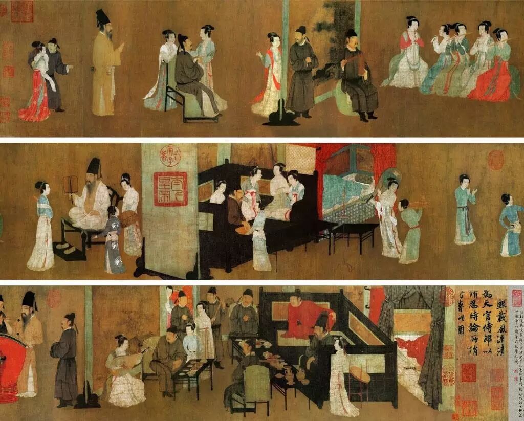 《韩熙载夜宴图》历来的解读多是:那位写出“剪不断,理还乱”的后主李煜,某日突发奇想,认为“审音能舞,分书及画,名重当时”的老艺青韩熙载是南唐总理的得力人选,,认为大厦将倾最好的保命之道就是给自己泼脏水、上点眼药;具体实施的策略就是不断邀请后主他最得力的狗仔队长顾闳中以及周文矩等,参加自己的各种爬梯,让女仆与之相见,或调戏,或殴击,或加以争夺靴笏,过程荒唐不堪且口味与颜色甚重。抢到头条的顾闳中火速把消息传递给了后主,于是有了《韩熙载夜宴图》。后主李煜看完画卷,小编揣测当以“若真有所癖,将沈缅酣溺,性命死生以之,何暇及钱权宦贾之事”给韩熙载做了定性和定论,让这位南唐的三朝元老得以善终。