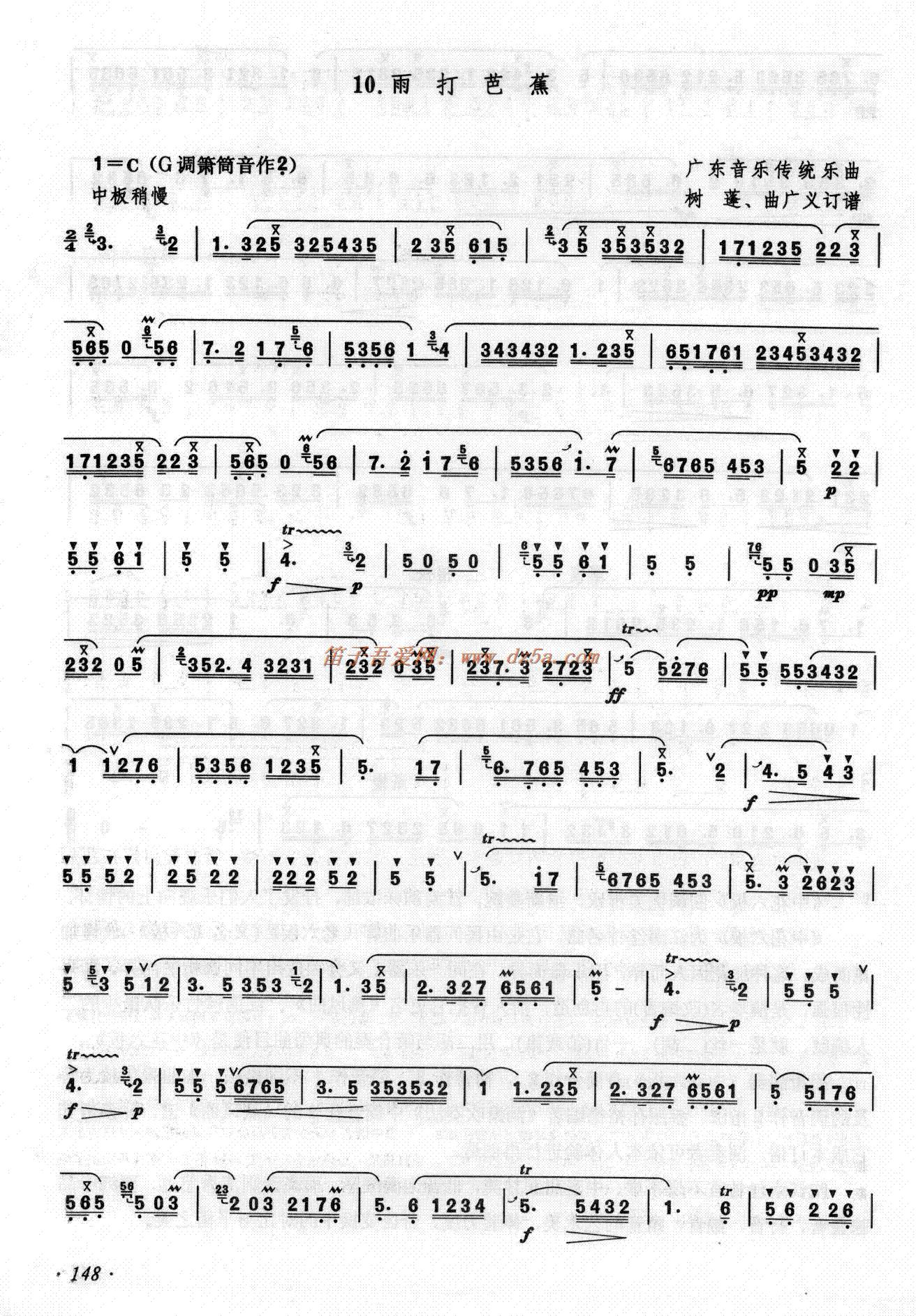 雨打芭蕉是中国汉族民间器乐曲。乐谱最早载于1921年丘鹤俦所编《弦歌必读》,后由潘永璋改编,成为广东音乐代表性曲目。曲首以流畅明快的旋律表现人们的喜悦之情,然后接以句幅短小、节奏顿挫、并比排列的乐句互相催递,短促的断奏,犹似雨打芭蕉淅沥之声,极富南国情趣,最后为气氛热烈的快板段落,风格朴实清新,初夏时节,雨打芭蕉淅沥之声,表现出人们的欣喜之情,极富南国情趣,体现了广东音乐清新流畅活泼的风格。