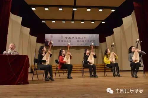 讲座的下半场,刘德海先生与几位得意门生讲演配合,说是一场琵琶音乐会一点儿也不为过。《周少梅书房里的琴声》还萦绕在耳边,童心未泯的刘德海先生却要大家跟《太阳公公晚安》了。大伙儿不依,他与学生几人便又带着所有人去《听好妈妈讲好故事》。听完了《柳青娘》的诉说,大家意犹未尽,便又乘坐《昭陵六骏》饱览塞外风情,策马奔腾,共享大好河山!人人都说二胡版的《二泉映月》撩人心弦,他的爱徒李佳又偏将琵琶版的《二泉映月》弹得如泣如诉。低眉信手,拨尽琵琶,四弦指下,甜酸苦辣!