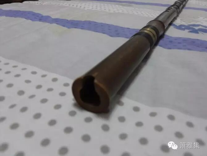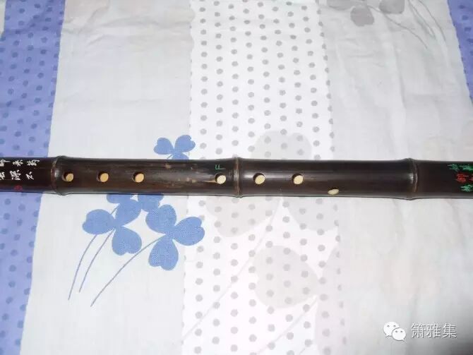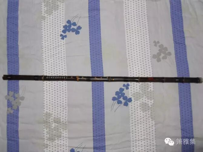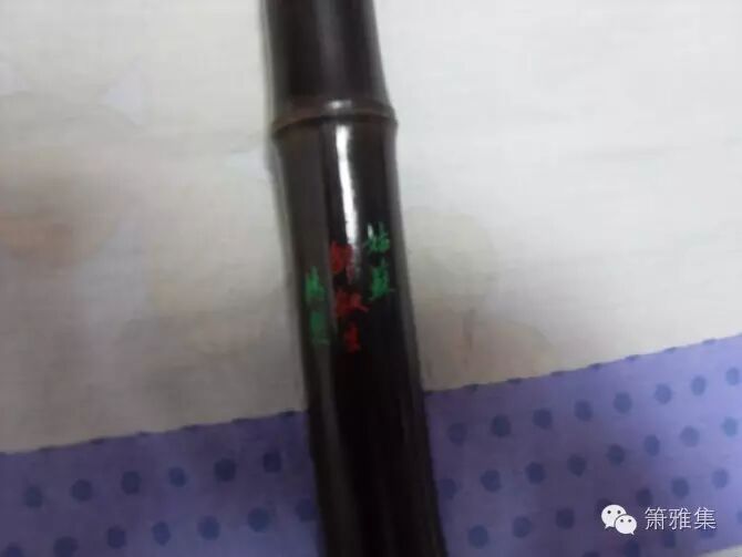 这支箫是我所用时间最长的箫,是2000年在石家庄考试时偶然碰到买的,作者不详,但是箫绝好,扁身(听说箫扁些反而音色好),材质是上好的黄鳝竹(紫竹中的精品),我也记不得买时是什么样子,但现在年久磨合,箫身乌亮,似有层漆般,看着特别的悦心,最难得的是指空被竹节平均分配,上竹节四个,下竹节四个,这样天然的材质可不可多得。但那时年少无知的我将它的顶盖给去掉了,现在箫箫还是很好吹,音量稍大。