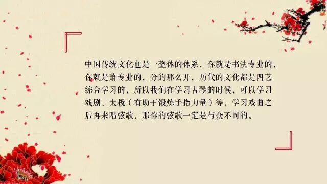 中国传统文化也是一整体的体系,你就是书法专业的,你就是萧专业的,分的那么开,历代的文化都是四艺综合学习的,所以我们在学习古琴的时候,可以学习戏曲、太极(有助于锻炼手指力量)等。学习戏曲之后再来唱弦歌,那你的弦歌一定是与众不同的。