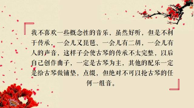 我不喜欢一些概念性的音乐,虽然好听,但是不利于传承,一会儿又琵琶、一会儿有二胡,一会儿有人的声音,这样子会使古琴的传承不太完整,以后自己创作曲子,一定是古琴为主,其他的配乐一定是给古琴做铺垫,点缀,但绝对不可以抢古琴的任何一组音。