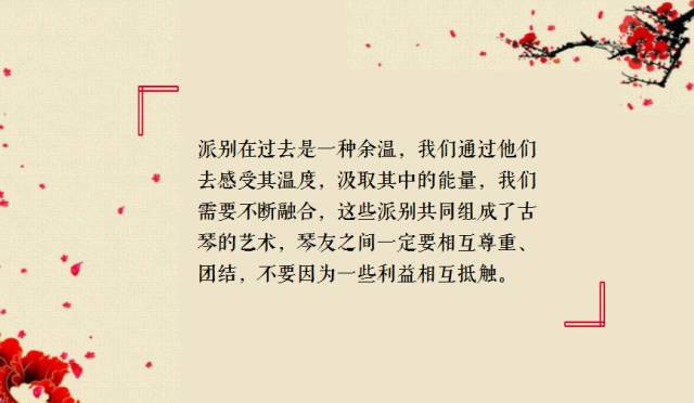 派别在过去是一种余温,我们通过他们去感受其温度,汲取能量,我们需要不断融合,这些派别共同组成了古琴的艺术,琴友之间一定要相互尊重、团结,不要因为一些利益相互抵触。