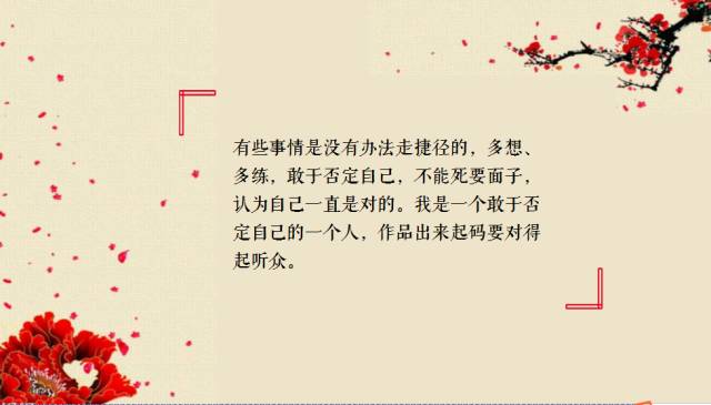 我没有过多的话,不论谁到我这里问红楼梦曲子,我就是三个字,真情美,听上去很简单,但是不同的人对待、理解曲意都会有很大的差异,不同的技巧表现出来差异也很大,因此一切大的名头都是假的,即使你是世界级的演奏家也没什么的,你的技巧和想法,一切都要达到一定的高度,我们是因为作品才出彩,没有作品,什么也不是,尊重作品,尊重一切,王老师就是这样的一位大师。