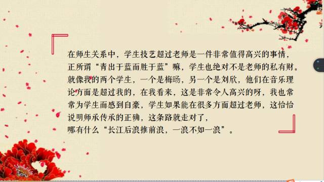 就像我的两个学生,一个是梅旸,另一个是刘欣,他们在音乐理论方面是超过我的,在我看来,这是非常令人高兴的呀,我也常常为学生而感到自豪,学生如果能在很多方面超过老师,这恰恰说明师承传承的正确,这条路就走对了,哪有什么“长江后浪推前浪,一浪不如一浪”。以前在我的师兄弟中,有人说我欺师灭祖,说归说,随他们去。