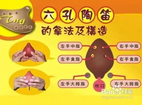 第二,六孔陶笛是前面四孔后面二孔(另外后面还有一个出音孔),一般适用于初学者的有AF调(中音F调)或者AC调(中音C调),这两种六孔陶笛基本上能够适应大部分练习的曲子,可以演奏神话,星月神话,一剪梅、天空之城、故乡的原风景等等曲子,基本指法如下图所示。