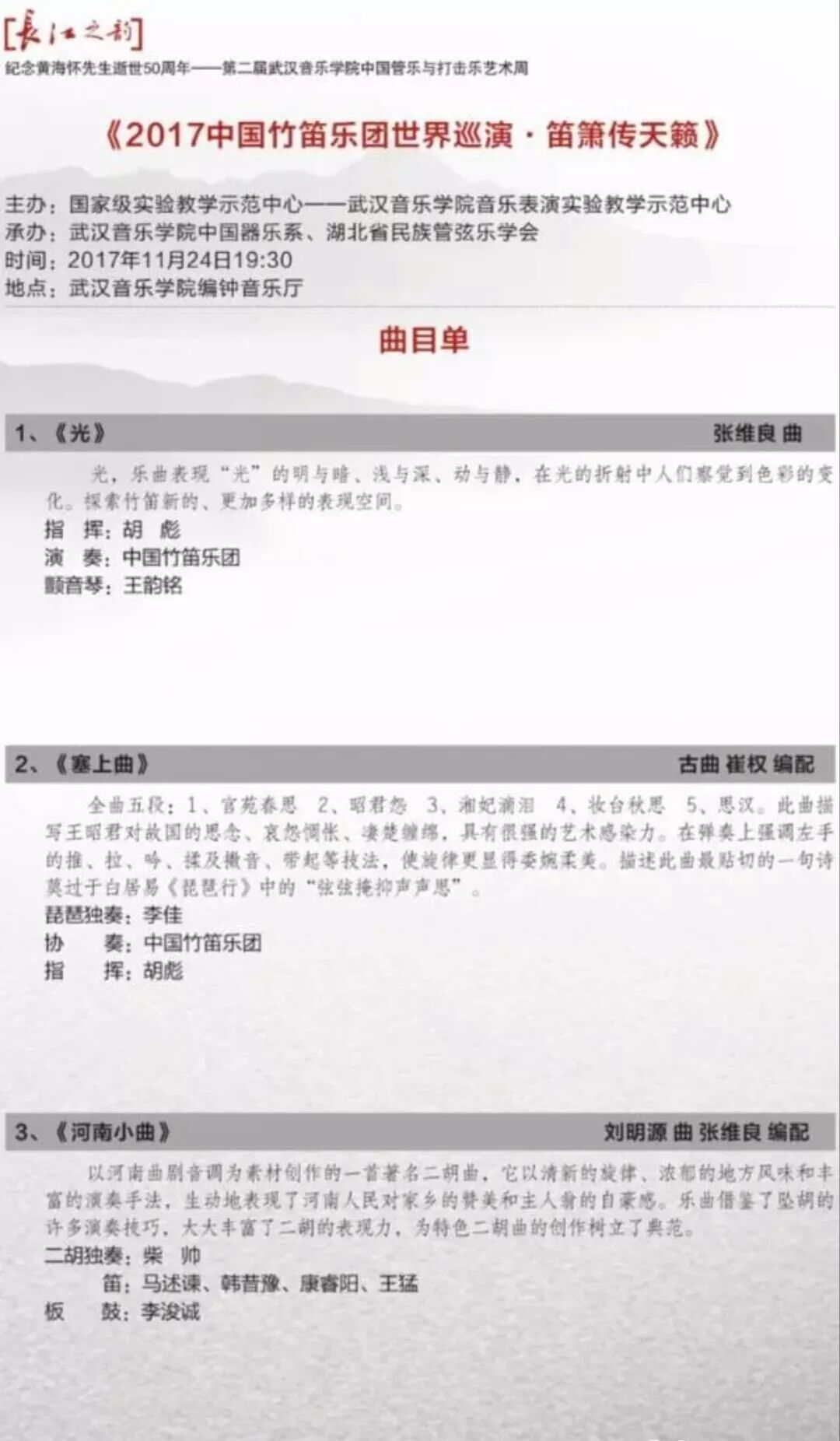 2017年11月24日我国著名竹笛演奏家,教育家,中国音乐学院教授,博士生导师张维良先生携中国竹笛乐团至武汉音乐学院开启了世界巡演武汉站。据悉本次音乐会为中国竹笛乐团世界巡演的首个国内站。音乐会后,中国竹笛乐团将前往广州星海音乐学院为广州的笛箫爱好者们带来一场精彩的文化盛宴。