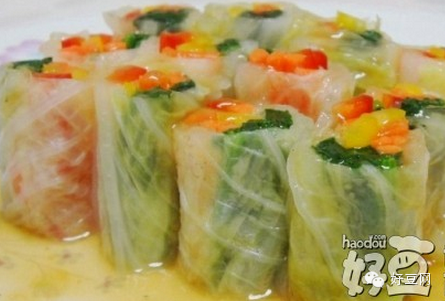 3)将蔬菜丝码在白菜叶上卷成卷,切成段