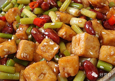 4)炒锅下油烧热,下豆腐丁炸至金黄沥油捞出。