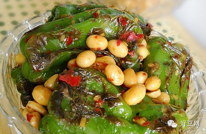 4)锅中油热,下炕好的青椒,煎出虎皮;倒入腊八豆,炒匀。