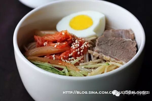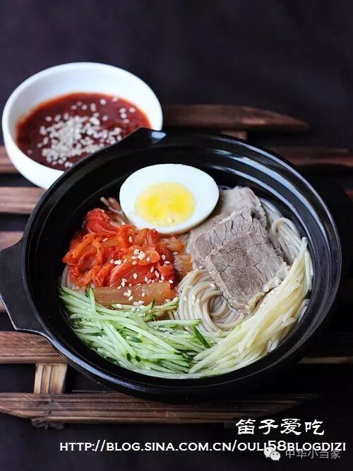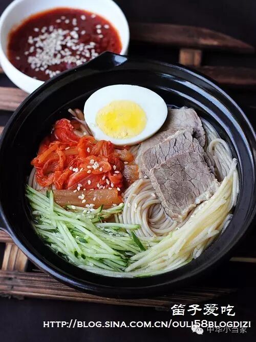 原料:冷面、牛肉、葱姜、大蒜、糖、盐、醋、生抽、冰块、鸡蛋、梨(苹果)、黄瓜、泡菜