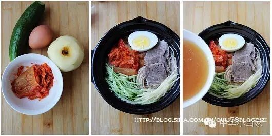 冰凉的冷面团成面团,放在一只大碗里,黄瓜丝、梨丝(苹果丝)、泡菜、牛肉片、半个鸡蛋放上去,再把冷藏好的肉汤倒进去。