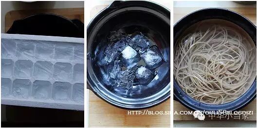 冷面须煮2~3分钟之后,用冷水清洗多次,然后放在事先备好的冰块上冷镇