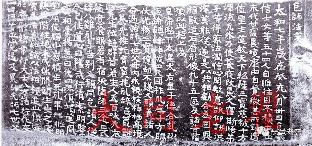 这块题记记下了当时大同城内五十四名善男信女在云冈十一窟东壁雕造九十五躯石佛的缘由,含蓄地表露了佛门弟子们对太武帝灭佛的不满心理,同时对文成帝复法后佛事中兴的“盛世”大加赞颂,对崇尚佛法的当权者孝文帝、文明太后的感激之情溢于言表,甚至连同刚刚出世的皇太子也致以良好的祝愿。这块造像记具有很高的历史价值,它为确定开凿云冈诸窟的分期提供广真实的历史资料。由于它是北魏迁都洛阳前十多年的作品,所以它比迁洛后开凿的龙门石窟的众多造像记都早,更能反映太和年间的书法风格,因而在书法艺水上也有较高的价值。