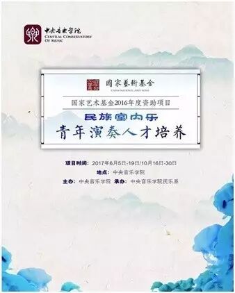 国家艺术基金2016年度资助项目“民族室内乐青年演奏人才培养”是由中央音乐学院主办、中央音乐学院民乐系承办的,为弘扬中国优秀传统文化,推动民族音乐事业的发展,加强民族室内乐演奏人才队伍建设而举办的,小批量、高层次,重在经验传授和实践提高,以培养高水准、复合型的民族室内乐演奏人才为目的的人才培养项目。
