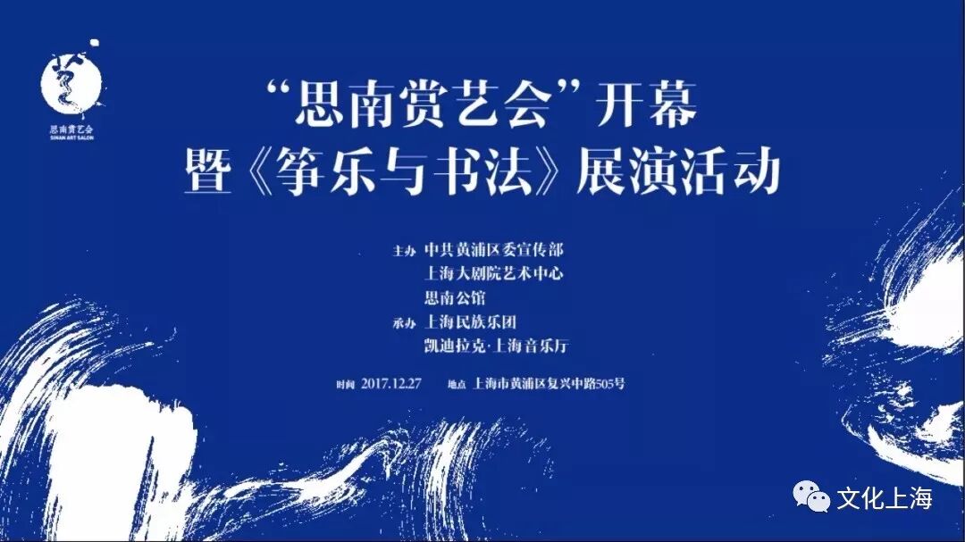 12月27日,、上海大剧院艺术中心与思南公馆联合主办的“思南赏艺会”正式启动。上海市文化广播影视管理局艺术总监吴孝明,、宣传部部长余海虹,上海大剧院艺术中心党委书记、总裁张鸣,中国上海国际艺术节中心总裁王隽,永业集团党委书记、董事长、思南公馆董事长钱军出席开幕暨《筝乐与书法》展演活动,并为“思南赏艺会”LOGO揭幕。