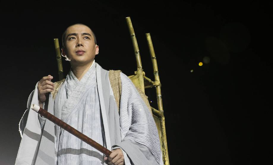 就在《玄奘西行》公开彩排前一日,丁晓逵在他的朋友圈里公布了“落发”的照片:为了出演玄奘一角,他剃了个同出家人一模一样的“发型”。6月,在北京的天桥剧场,大幕揭开,舞台灯亮,乐声响起。青年玄奘(丁晓逵饰)问他的师父(王次恒饰),如何才能像他一样拥有纯净的笛声?师父回答“笛声即是佛法”“有一丝杂念就将笛子放下”。语毕,师徒二人以悠扬清亮的重奏接续了剧情行进,印证音乐与佛法相通之理。“潜关”一幕,玄奘与一群戍守边疆的将士谈论通关文牒,侃侃说起自己“西去天竺的初心,在心中念念不忘”。随后,丁晓逵拿起手中的箫开始吹奏,以旋律代替语言,以音乐带观众入情境……一长串的台词与观众看的字幕机所示严丝合缝,剧情行进在字正腔圆的道白和恢宏壮丽的音乐交织之中,显得格外有吸引力。
