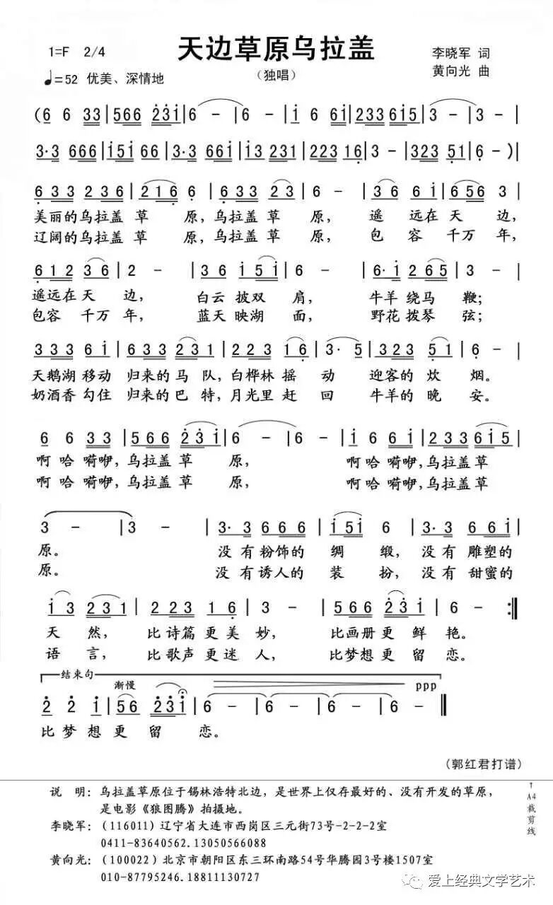 作词者介绍:李晓军,男,1949年生人,祖籍河北省唐山市。现为辽宁省音乐家协会会员、大连市西岗区音协副主席、中国音乐著作权协会会员。创作词作一千余首,发表作品700余首,获得各种奖项若干,有500余首作品被作曲家谱成了曲,经歌唱家、歌手演唱並录制成CD、DVD光盘的歌曲近100首。