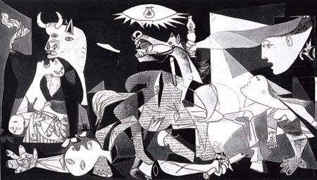 毕加索虽然热衷于前卫艺术创新,同时并不放弃对现实的表现,这或许也是他选择画《格尔尼卡》的一个重要原因——公牛象征,受伤的马象征受难的西班牙,闪亮的灯火象征光明与希望。