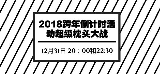 2018跨年倒计时活动超级枕头大战,2018 New year Countdown Amazing Pillow Fight。超酷超解压的跨年倒计时!砸掉霉运,砸掉烦恼,砸出新年的好运、爱情和幸福!在枕头漩涡之中迎接2018年的到来!