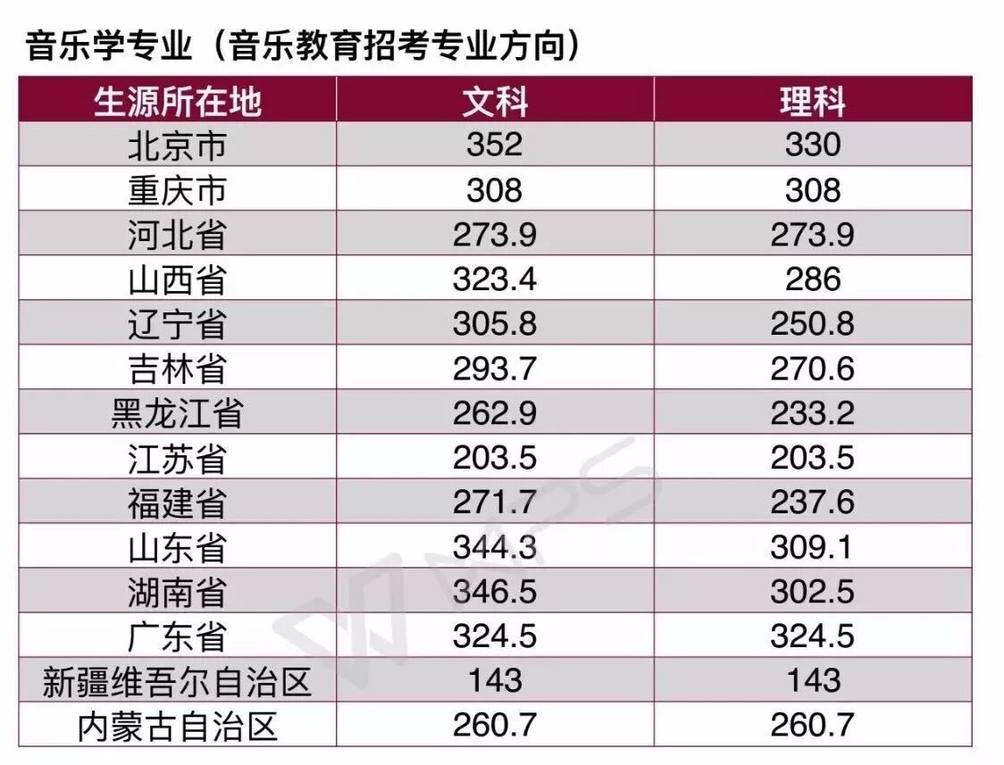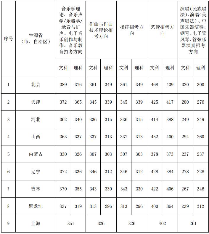 1、音乐学专业(含音乐教育、音乐学理论、艺术管理、钢琴调律招考方向)335分;