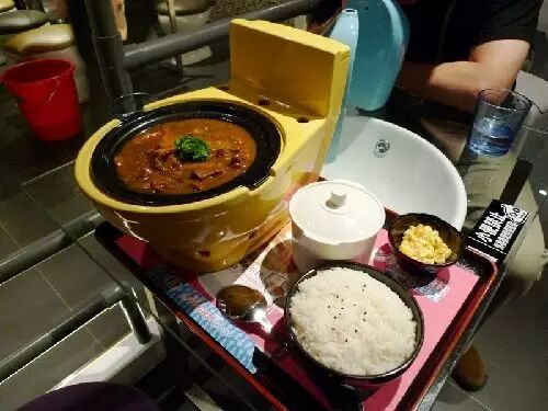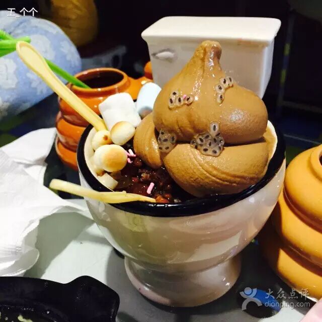 推荐理由:在厕所吃饭是不是有点不可思议?不要惊讶,这家便便满屋就是一家以厕所为主题的餐厅。在这里,随处可见陶瓷马桶,桌椅甚至盛菜的器皿都是马桶或者厕所器具造型的,比如这里的火锅(售价30元)就是在一个小小的抽水马桶里。造型有趣,名字也挺有心意。巧克力冰激凌在这里被戏称为“两女一杯”(售价15元,感兴趣的看客可以谷歌一下这个,不过最好还是算了,好奇害死猫,这个视频着实令译者看完后一天都没有食欲。)幸运的是,虽然名字比较倒胃,但是实际上这里的口味比较普通。但是和你的朋友们约上一起,吃吃拍拍还是蛮有意思的。