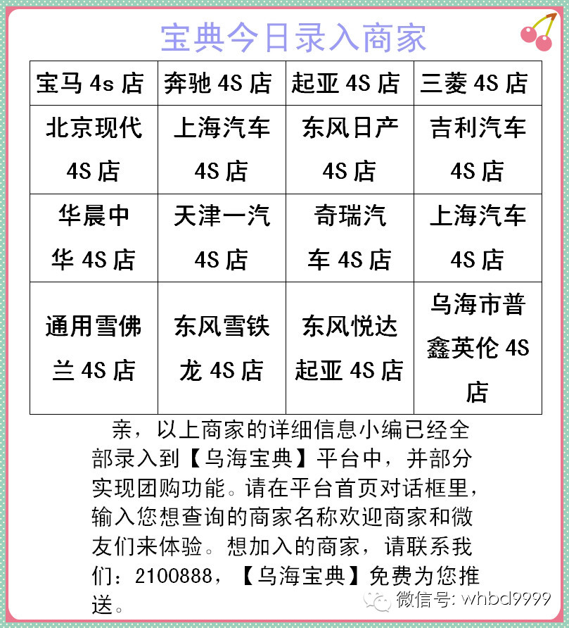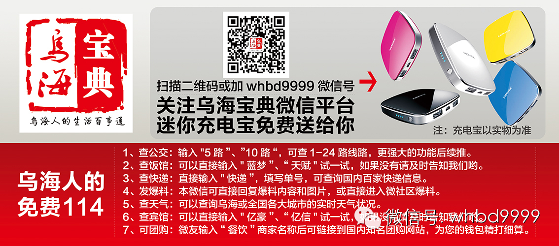 【乌海宝典】的微友们,想发布生活信息,【乌海宝典】微信公众平台为您免费发布,例如:找工作,招聘启示,出租,出售,转让,二手车,二手房,求租,征婚交友,寻物启示,寻人启示,一系列的生活信息内容+联系电话一律发到【乌海宝典】邮箱里whbd9999@163.com,希望【乌海宝典】能真正的帮助到您。【乌海宝典】成为您生活的好帮手!