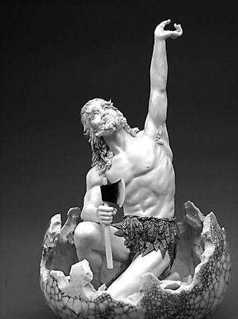 他拔下了一颗牙齿,将它化成一柄巨斧,然后使劲向周围挥去。咔嚓几声巨响,“鸡蛋”被打破了,鸡蛋里那些轻而清的物质冉冉上升,变成了天空;另一些重而浊的物质缓缓下降,形成了大地。