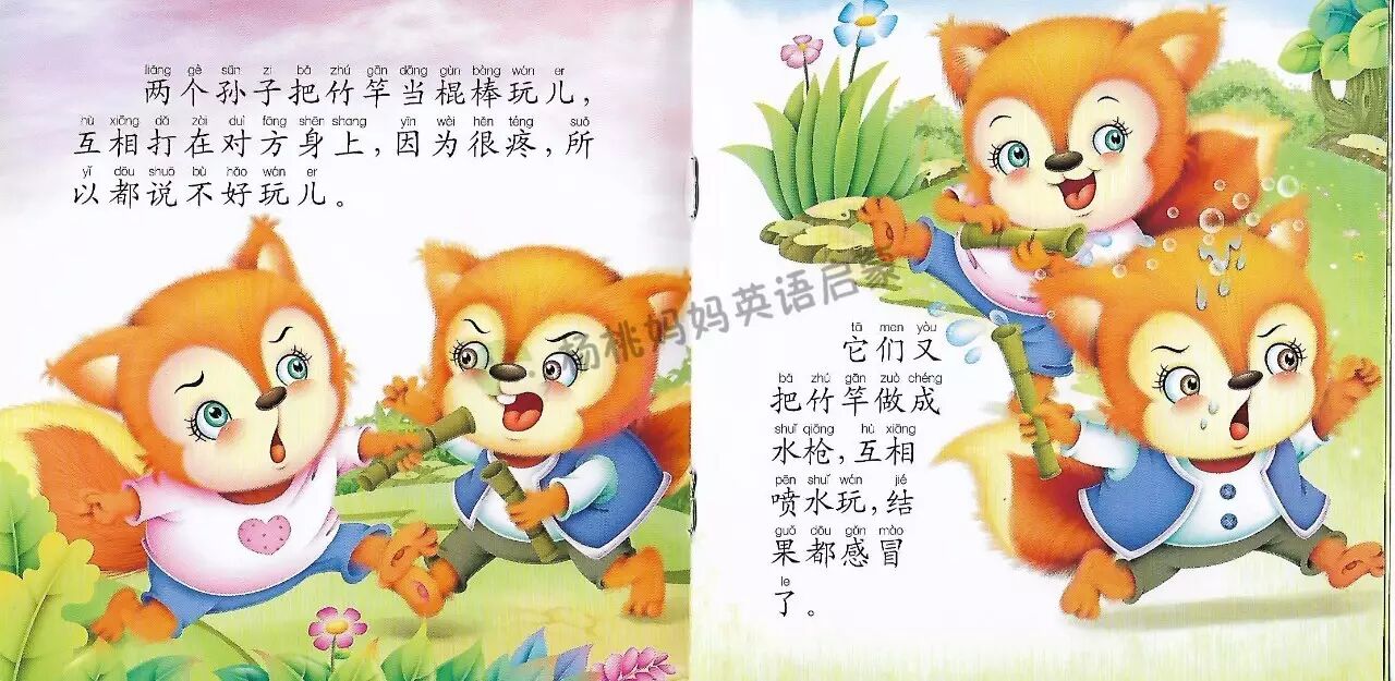 看到两只小松鼠squirrels说这是棍子,GrandpaSquirrel松鼠爷爷连忙解释到:“No, no, no.这不是棍子,这是竹竿,它来自竹子,别看它空心,这可是一种能屈能伸的植物哦!”