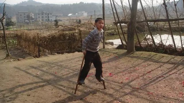 高脚应该是男孩子才会玩的玩意,但是胆大的女孩子也玩,用木棒削好,用钉子凿两个孔,再用小木头插进去,脚踩在上面,扶手的地方在按一个小木桩,使力用的,这就是一个靠自己的力气去走动的小高脚!