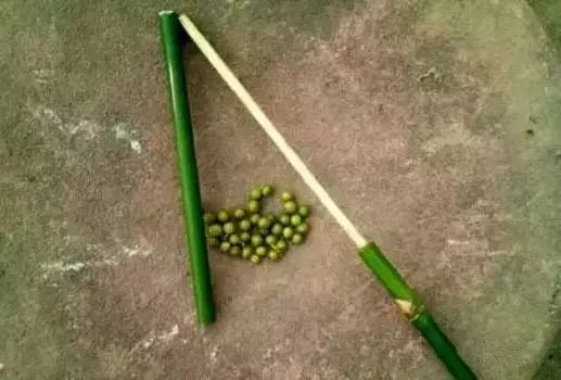 这种qiang做法比较简单,一根长度宽度合适的篾片,一节半竹筒,挖两个洞,尾部一个小洞用于固定篾片,前半截一个比较长的洞,便于篾片移动发力将石头发射出去;这种qiang子弹随处可得,石子,树籽,小棍子.....个人最喜欢用棕树籽,一大串上面起码有上千粒,玩的时候手上拿着qiang,肩膀上抗的树籽,好拉风....