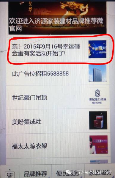 双击二维码关注(济源家装建材品牌推荐公众平台),即可砸金蛋中大奖!全自动洗衣机,微波炉,挂烫机等等 砸金蛋有奖活动游戏操作指南,新朋友关注后公众平台自动弹出图片点击红色框,老朋友在公众号发送消息,输入砸金蛋发送,公众平台自动弹出图片点击红色框,
