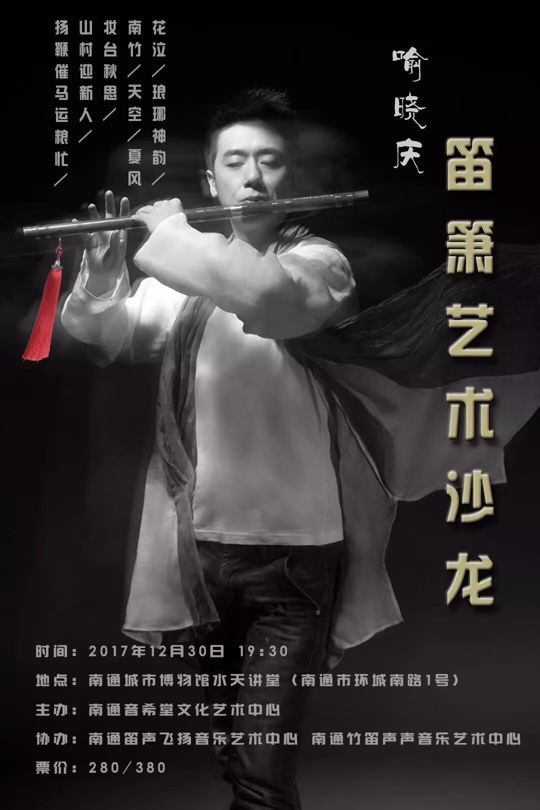 2017年12月30日19.30分,在南通城市博物馆水天讲堂(南通市环城南路1号),著名竹笛演奏家喻晓庆与广大笛友们开展笛箫艺术沙龙。活动中,您不仅能近距离欣赏到《花泣》、《琅琊神韵》等传统名曲以及《夏风》、《南竹》等喻老师原创专辑中的作品。还有机会和喻老师当面交流,走进演奏家的音乐世界,感受儒雅男神的个人魅力。