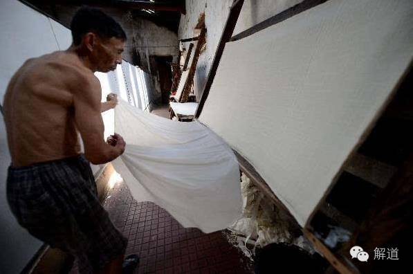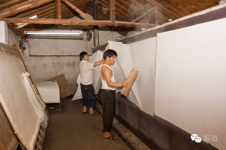 由师傅提起纸帘,靠准纸板杆放下,纸帘伏于湿纸板上,动作要慢,让上一张与下张完全帖伏,否则会起气泡,然后坐于纸板前双手轻轻翻起帘头木杆,看看湿纸是否整齐,后按帘头木杆,使靠近帘头处的纸浆折叠而产生帘头唇(压干后揭纸时湿纸拉力增强起保护作用)、再提起纸帘进行第二张纸的操作,如此重复,重叠一定湿纸层层进行榨纸。