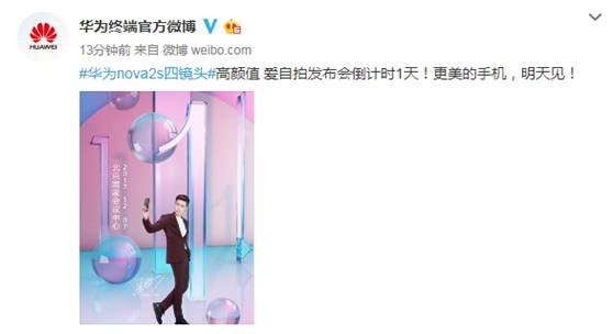 而从倒计时1天海报的配色来看,应该选用的是国际色彩服务咨询权威机构潘通所定的年度流行色:静谧蓝+粉晶色,这样的色彩组合是潘通首次同时选出两款年度流行色,证明了这样的色彩搭配有多么让人欲罢不能无法割舍。华为选用这样的配色做海报主色调,不仅夺人眼球,更显靓丽通透,而倒计时第二天及第三天的海报里张艺兴手持的华为nova 2s,正是这样清新的蓝色,这种颜色在以科技感称霸的手机界里可不常见,但却是当下年轻人,尤其是年轻女生的心头草,看来华为此次目标客户定位的非常精准。