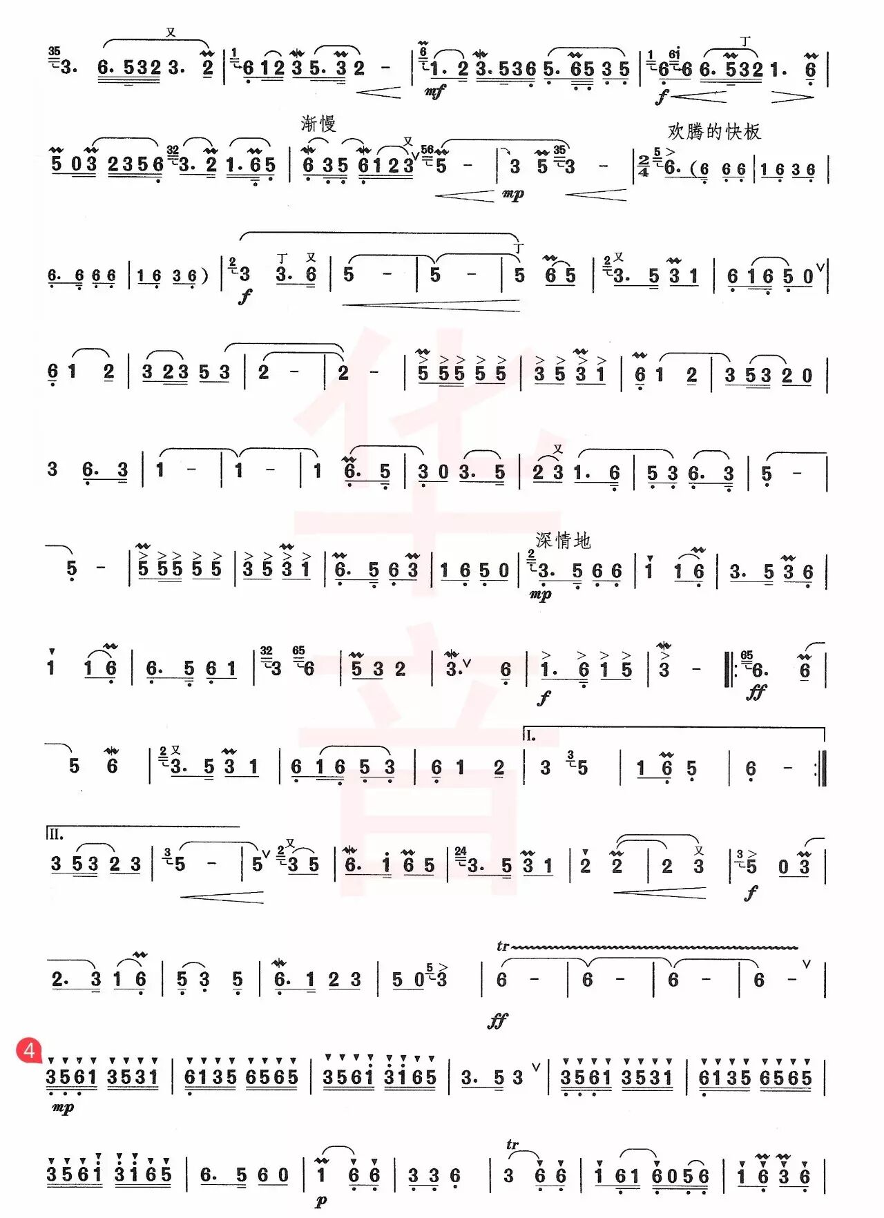 ▲欢腾的快板富有湖南花鼓戏的韵味,热烈中隐有鼓声点点,又有深情交融、奔放洒脱、诙谐乐观的神态跃然在乐曲中,几番递升的旋律把乐曲层层推向高潮。演奏时要把深深的情意富有神韵地呈现出来。